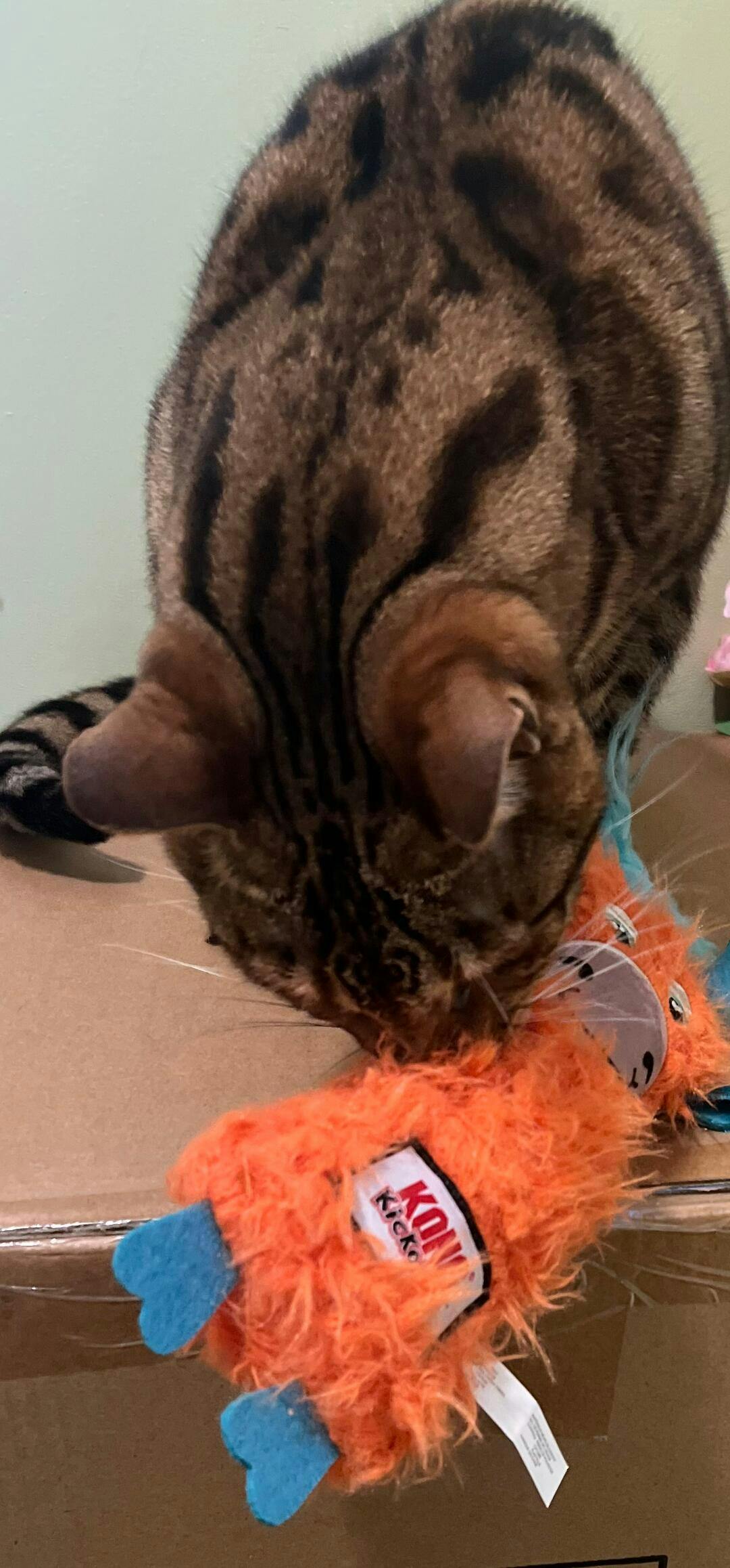 The KONG Kickeroo Highland Cow is designed to inspire energetic, full-body play. Its long, plush body encourages cats to wrestle, bite, and kick with their hind paws, supporting healthy exercise and natural feline behaviors.