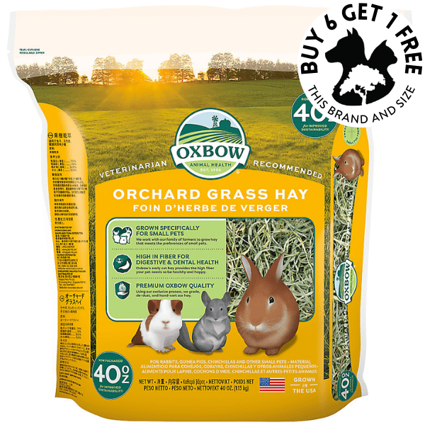 Oxbow Orchard Grass Hay is a high-fiber, aromatic hay with a soft texture and sweet flavor that small pets love. Ideal for rabbits, guinea pigs, chinchillas, and other herbivores, this premium hay encourages natural foraging behavior and supports overall health.